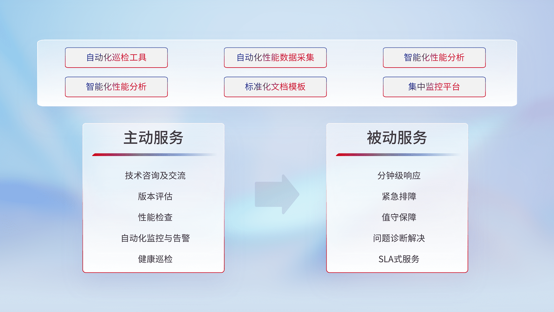 智能化工具和标准化文档,,保障服务质量,,,,提供主动服务(包含技术咨询、、、、版本评估、、性能检查、、、、自动化监控与告警、、健康巡检)和被动服务包含(分钟级响应、、、、紧急排障、、值守保障、、问题诊断解决、、SLA服务)。。。。